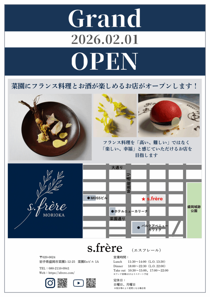 s.frère(エスフレール)は盛岡出身の兄弟(兄:オーナーシェフ、弟:ソムリエ)が営むフランス料理とお酒が楽しめるお店です。