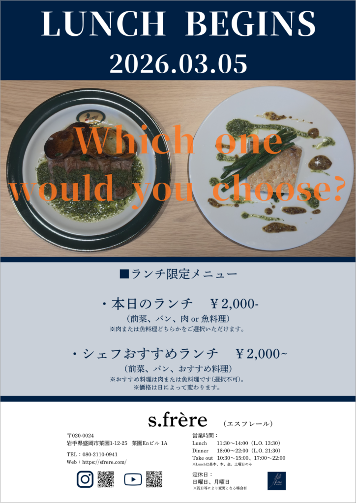 s.frère(エスフレール)は盛岡出身の兄弟(兄:オーナーシェフ、弟:ソムリエ)が営むフランス料理とお酒が気軽に楽しめるお店です。